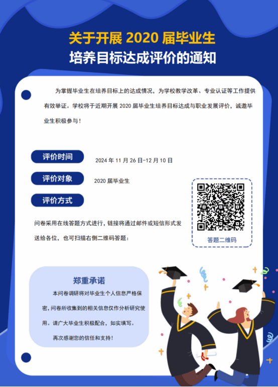 请各学院高度重视本次毕业生调查评价工作,前期相关调查通知已以邮件方式发送到2020届毕业生邮箱,为进一步推进本次调研工作,请各学院2020届毕业生辅导员落实通知相关毕业生于2024年12月10日前完成问卷调查填写。